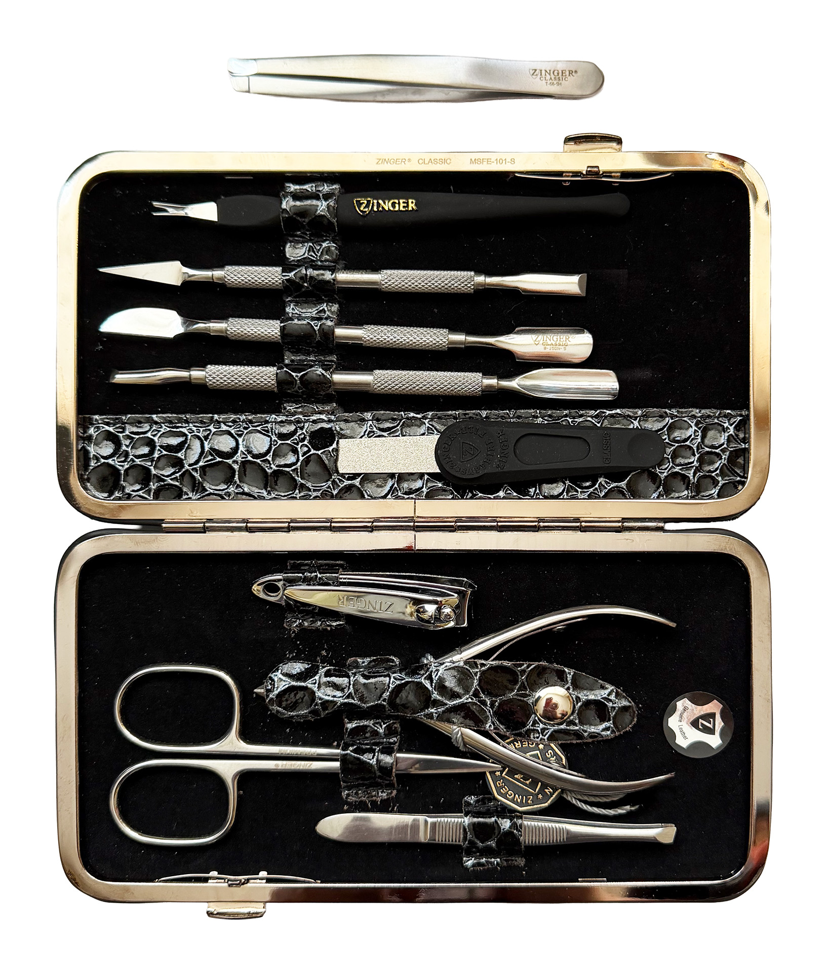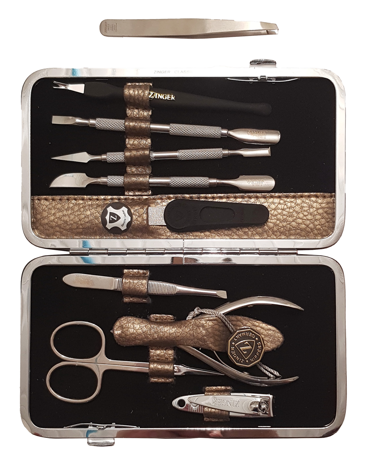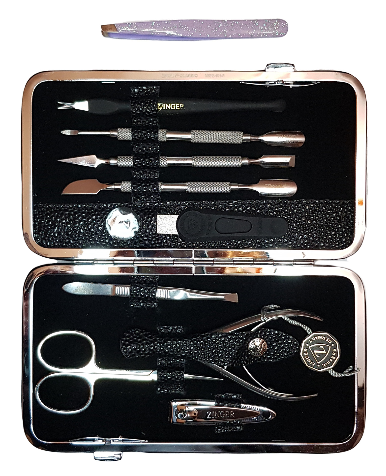 Маникюрный набор Premium-качества Zinger MSFC-101-3 S, 9 предметов + пинцетМаникюрный набор c инструментами Premium-качества ZINGER MSFС-101-3 S. Футляр изготовлен из натуральной кожи. Внутренняя отделка футляра - мягкий велюр, имитация замши. Подарочная коробка с логотипом, внутри отделана бархатной бумагой. В набор входят 9 предметов: кусачки для кутикулы, ножницы для кутикулы, пинцет скошенный, книпсер, пилка алмазная, 3 металлических пушера, триммер. Отдельно - подарок - пинцет в контейнере.Производитель: Zinger Цвет * Недоступно Недоступно Недоступно Недоступно Недоступно Недоступно Недоступно Недоступно Недоступно 5 280,00 ₽ Количество: В корзину Пользовательский список пожеланий OKДобавить в список пожеланийСравнитьСообщить другуИнструменты изготовлены из высококачественной стали марки AISI 420 (40Х13). Технология закалки позволяет сочетать необходимую упругость и высокую твёрдость металла. Вся серия заточена вручную, по стандартам мастеров маникюра: с дополнительной обработкой лезвий и полировкой кончиков. Инструменты произведены в Италии.Набор подходит как для домашнего, так и для профессионального использованияЦвет напыления-серебристый.ХарактеристикиИмя атрибутаЗначение атрибутаКоличество в упаковке9 + 1 шт.ПроизводствоРоссия