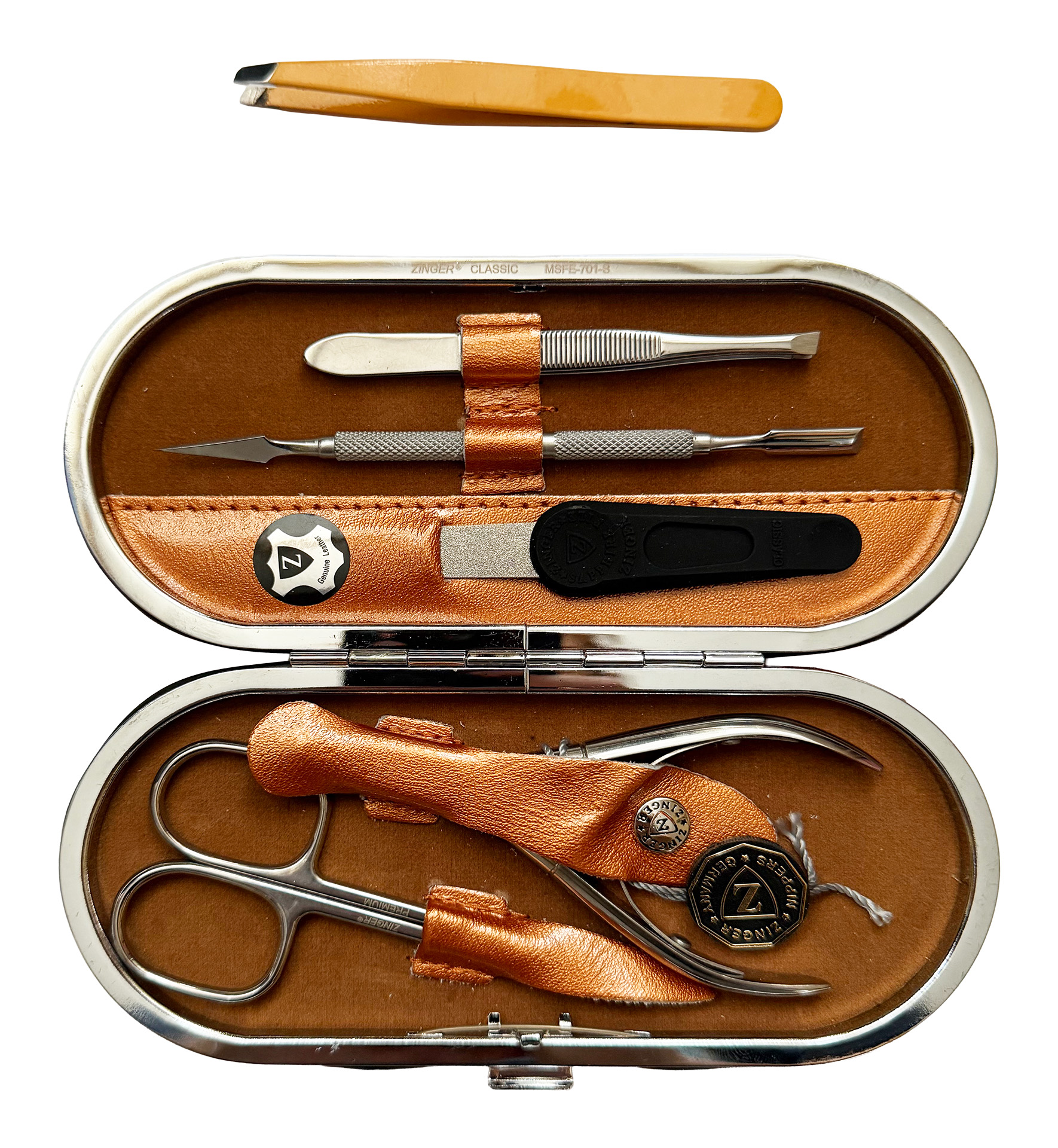 Маникюрный набор Premium-качества Zinger MSFE-701-3 S, 5 предметов + пинцетМаникюрный набор c инструментами Premium-качества ZINGER MSFE-701-3 SM. Футляр изготовлен из натуральной кожи. Внутренняя отделка футляра - мягкий велюр, имитация замши. Подарочная коробка с логотипом, внутри отделана бархатной бумагой. В набор входят 7 предметов: кусачки для кутикулы, ножницы для кутикулы, пинцет скошенный, пилка алмазная, 2 металлических пушера, триммер. Отдельно - подарок - пинцет в контейнере.Производитель: Zinger Цвет * Недоступно Недоступно Недоступно Недоступно 6 583,00 ₽ Количество: В корзину Пользовательский список пожеланий OKДобавить в список пожеланийСравнитьСообщить другуИнструменты изготовлены из высококачественной стали марки AISI 420 (40Х13). Технология закалки позволяет сочетать необходимую упругость и высокую твёрдость металла. Вся серия заточена вручную, по стандартам мастеров маникюра: с дополнительной обработкой лезвий и полировкой кончиков. Инструменты произведены в Италии.Набор подходит как для домашнего, так и для профессионального использованияЦвет напыления-серебристый.ХарактеристикиИмя атрибутаЗначение атрибутаКоличество в упаковке5 + 1 шт.ПроизводствоЮжная Корея