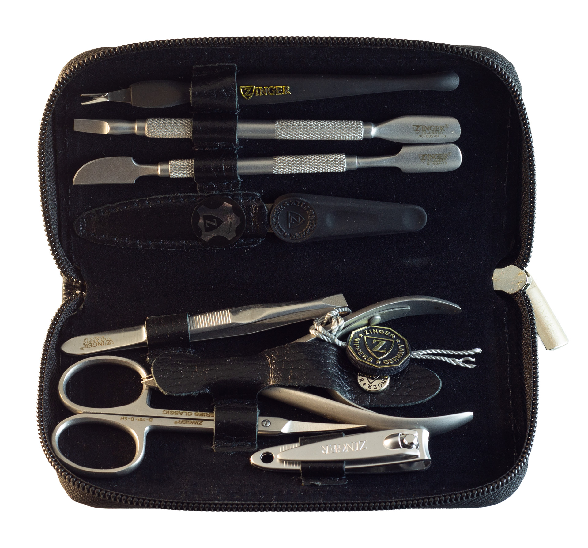 Маникюрный набор Zinger MS-1303-3 SM, 8 предметов, чёрный матовыйМаникюрный набор ZINGER MS-1303-3 SM. Футляр изготовлен из натуральной кожи. Внутренняя отделка футляра - мягкий велюр, имитация замши. Подарочная коробка с логотипом, внутри отделана бархатной бумагой. В набор входят 8 предметов: кусачки для ногтей , ножницы для кутикулы, пинцет скошенный, пилка алмазная, книпсер, 2 металлических пушера, триммер.Производитель: Zinger 5 923,00 ₽ Количество: В корзину Пользовательский список пожеланий OKДобавить в список пожеланийСравнитьСообщить другуИнструменты изготовлены из высококачественной стали марки AISI 420 (40Х13). Технология закалки позволяет сочетать необходимую упругость и высокую твёрдость металла. Вся серия заточена вручную, по стандартам мастеров маникюра: с дополнительной обработкой лезвий и полировкой кончиков. Цвет покрытия инструментов – серебристый .ХарактеристикиИмя атрибутаЗначение атрибутаКоличество в упаковке8 шт.Цветчёрный матовыйПроизводствоЮжная Корея
