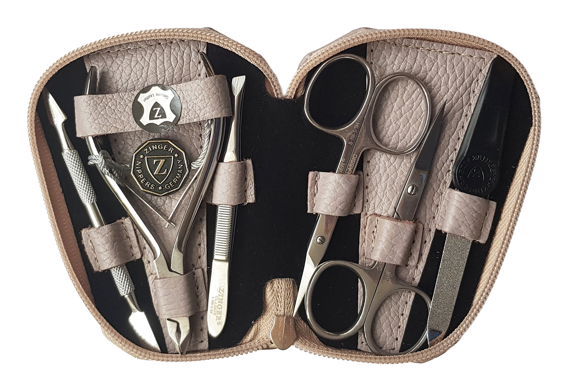 Маникюрный набор Zinger MS-7103 S. Футляр изготовлен из натуральной кожи. Внутренняя отделка футляра - мягкий велюр, имитация замши, цветом в тон коже футляра. Подарочная коробка с логотипом, внутри отделана бархатной бумагой. В набор входят 6 предметов: кусачки маникюрные, ножницы маникюрные 2 шт., двухсторонний пушер, металлическая пилочка, пинцет. Цвет покрытия металла - серебристый.