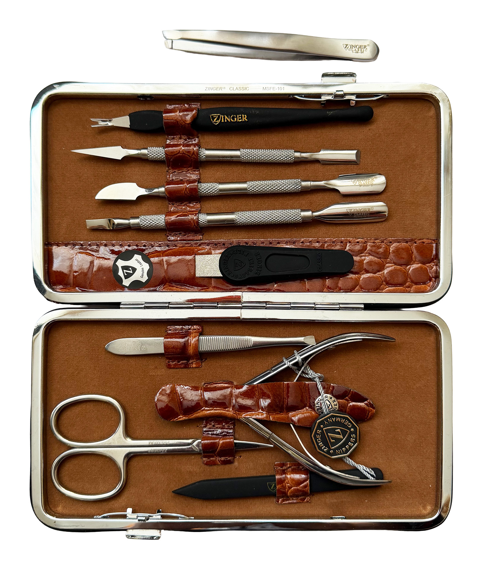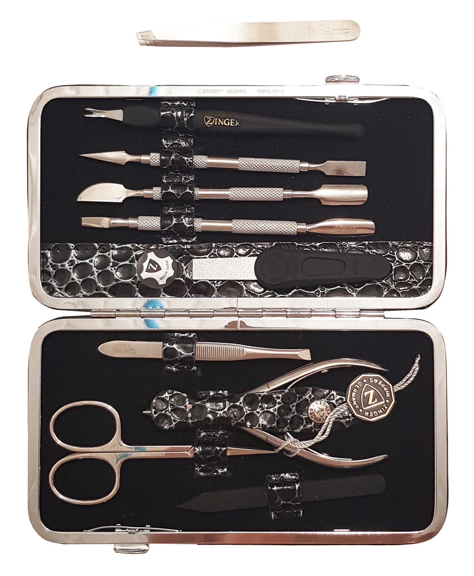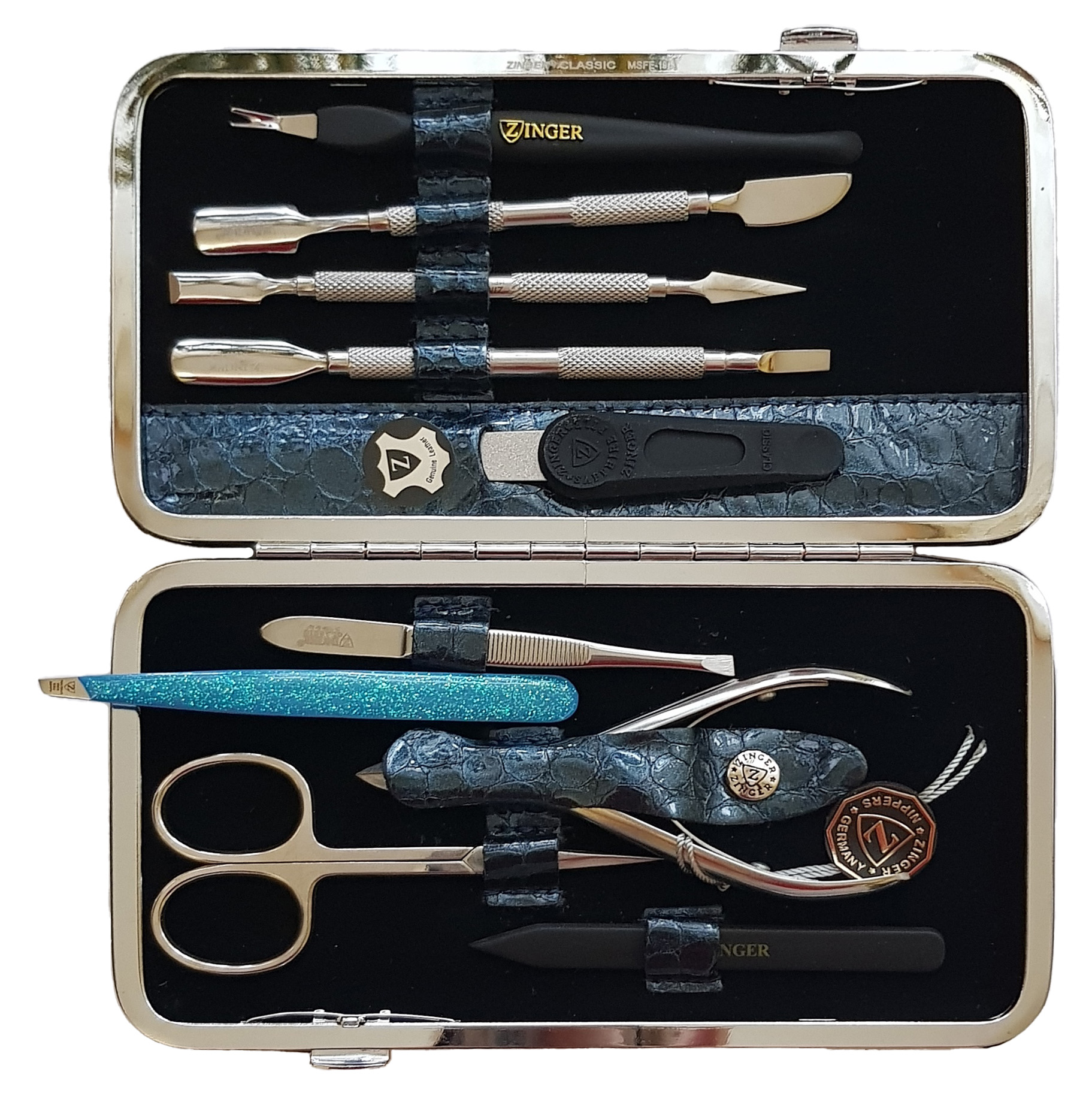 Маникюрный набор Premium-качества Zinger MSFE-101-3 S, 9 предметов + пинцетМаникюрный набор Zinger MSFE-101-3 S. Футляр изготовлен из натуральной кожи. Внутренняя отделка футляра - мягкий велюр, имитация замши, цветом в тон коже футляра. В набор входят 9 предметов: кусачки, ножницы, пинцет, триммер, металлическая пилочка, 4 маникюрные палочки. Отдельно - подарок - пинцет в контейнере. Цвет покрытия металла - серебристый.Производитель: Zinger Цвет * Недоступно Недоступно Недоступно Недоступно 4 850,00 ₽ Количество: В корзину Пользовательский список пожеланий OKДобавить в список пожеланийСравнитьСообщить другуИнструменты изготовлены из высококачественной стали марки AISI 420 (40Х13). Технология закалки позволяет сочетать необходимую упругость и высокую твёрдость металла. Вся серия заточена вручную, по стандартам мастеров маникюра: с дополнительной обработкой лезвий и полировкой кончиков. ХарактеристикиИмя атрибутаЗначение атрибутаКоличество в упаковке9 + 1 шт.ПроизводствоРоссия